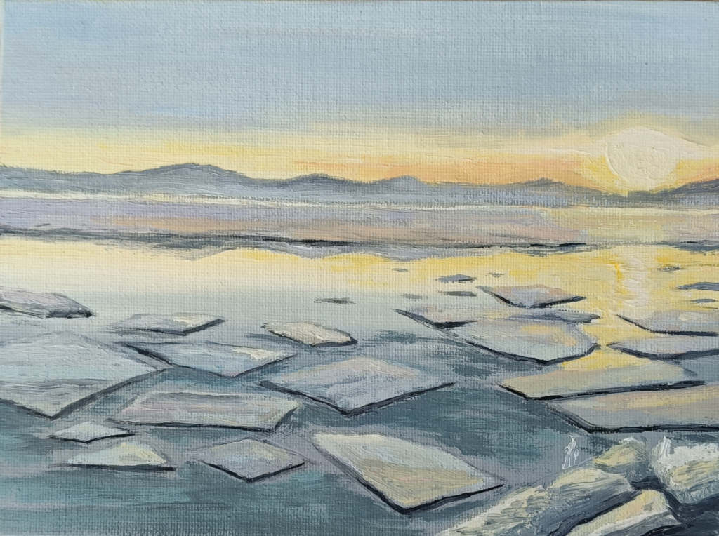 — В 2021, я тогда работала декоратором на новогоднем ассортименте, всего 2 месяца, но именно тогда я поняла, что хочу писать картины, что интересно мне только это и точка. Причем тогда я почувствовала острое желание научится работать с маслом. До этого я масла побаивалась, мне казалось, что им пишут только настоящие художники, а не самоучки как я. Я купила краски, причем не в художественном, где мое лицо уже примелькалось и мне было стыдно прийти и купить ученический набор масляных красок и расспросить какой растворитель взять, тк я ничего о технике работы с маслом не знала. Понимаете да? Насколько высокий уровень синдрома самозванца у меня тогда был. В итоге первыми моими красками стали сонет в наборе из 8 цветов и льняное масло. В тот же день я приступила к своей первой работе, она называется «Весенний байкал».