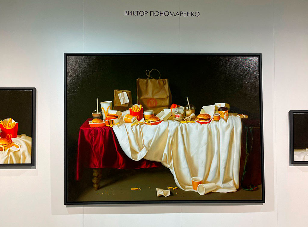 Художники, представленные на ярмарке, наглядно доказали, что академическая техника вовсе не означает идеологическую косность. Яркий пример — Виктор Пономаренко, чьи натюрморты с фастфудом работают в традиции vanitas, где одноразовые стаканчики и бургеры становятся символами бренности и быстротечности времени.