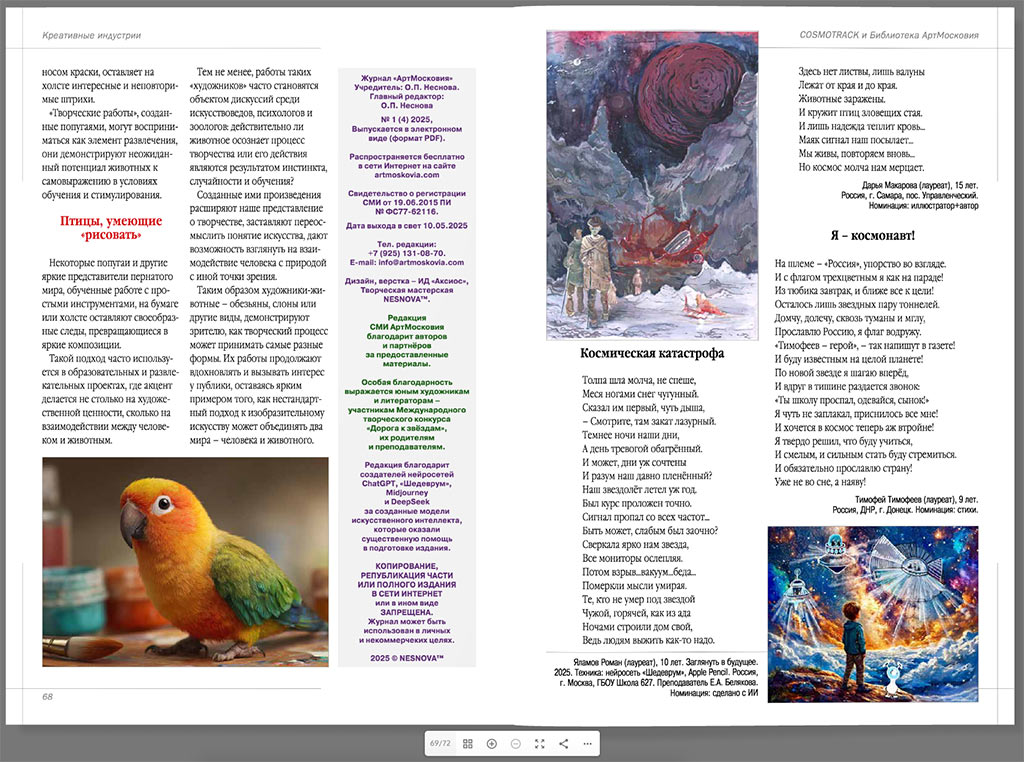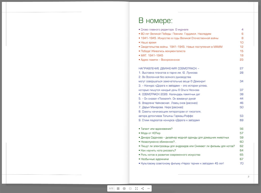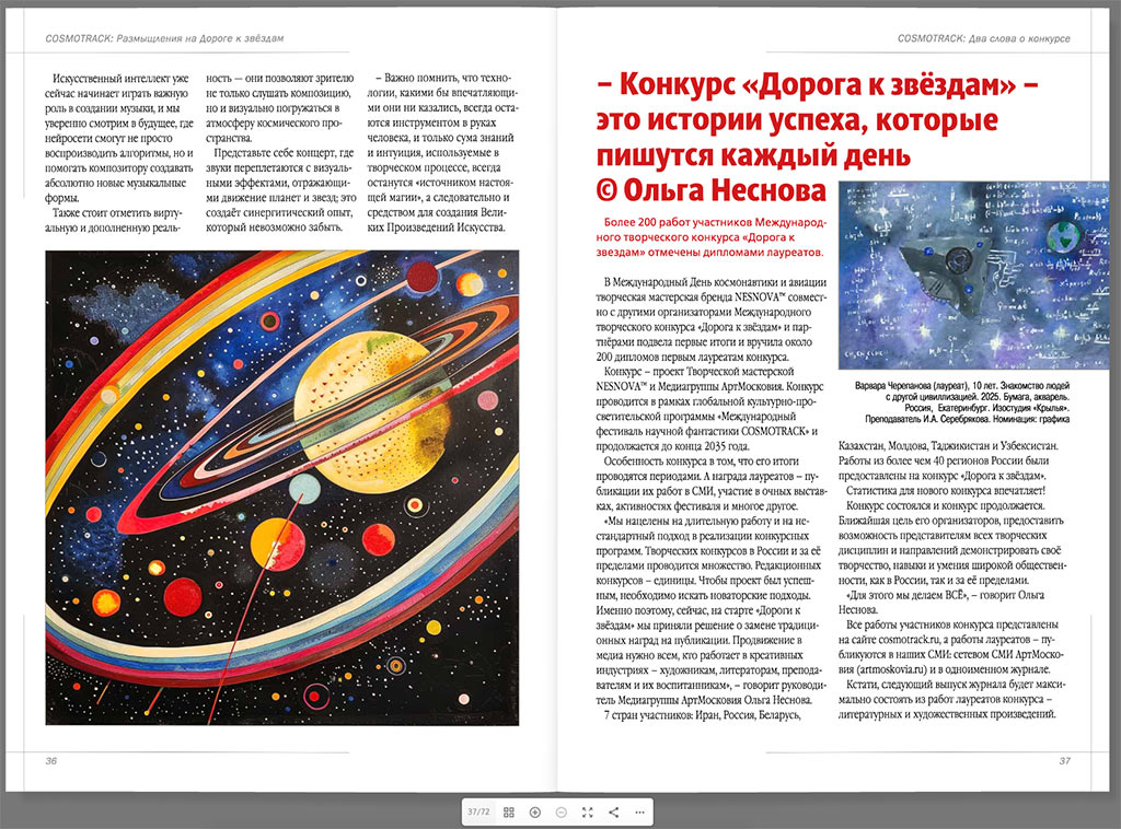 – Надеюсь, что наш труд не останется без внимания и будет интересен читателям, партнерам, коллегам и участникам конкурса, – говорит о журнале главный редактор АртМосковии Ольга Неснова. – На сайте встроено удобное приложение для чтения изданий в формате PDF. Для прочтения мы рекомендуем использовать устройства с размерами экранов от 10″ – планшет, компьютер и др.