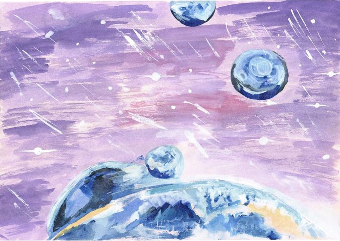 Художник Елисей Олейник, 8 лет. Дорога к звёздам. 2025. Бумага, акварель. | Россиия, ДНР, г.о. Донецк. ГБОУ «Профильная гимназия № 122 г.о. Донецк» ДНР. Преподаватель Светлана Жоржевна Калитенко. Номинация: графика