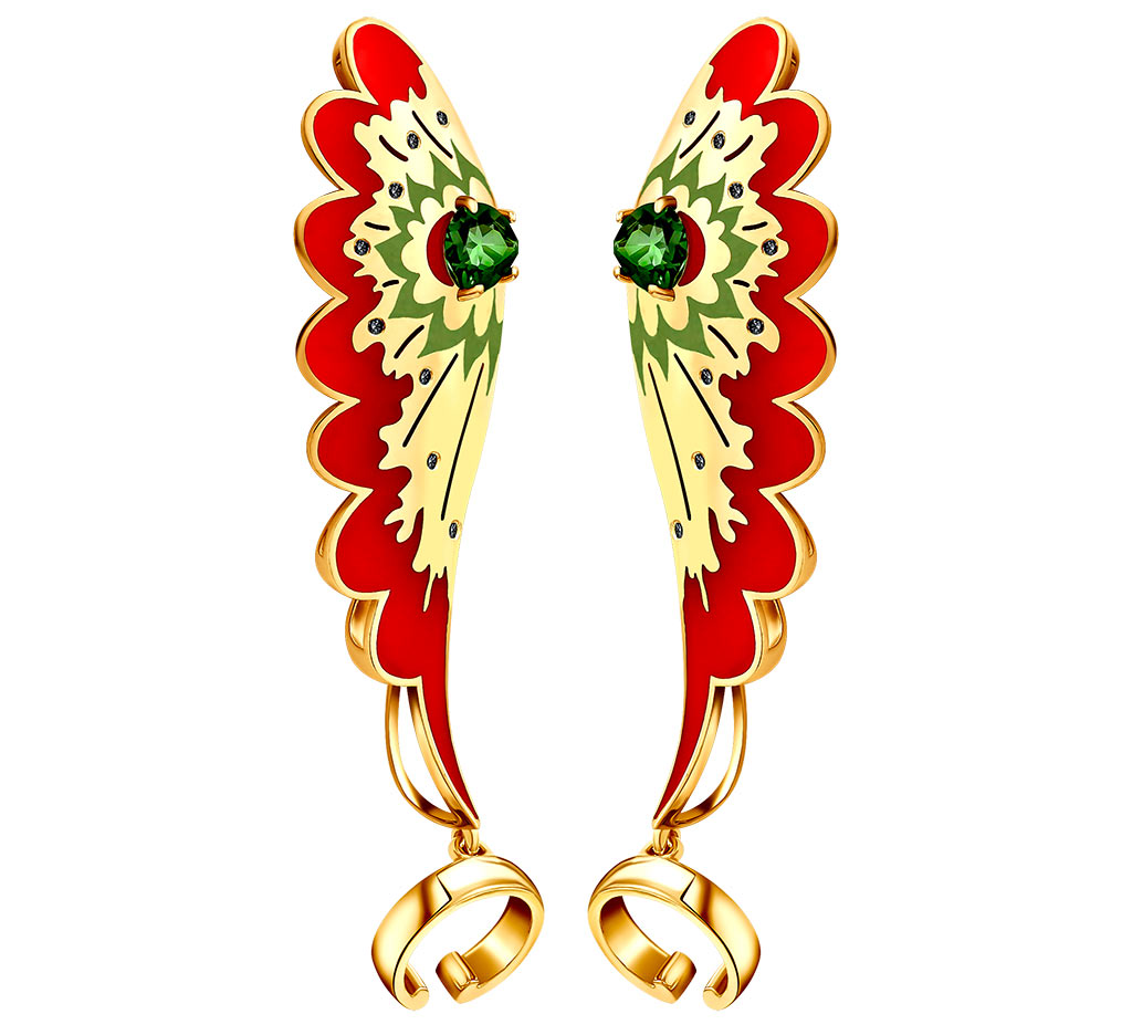 Вдохновляющий мотив коллекции, состоящей из кольца и серьги каффы, эффектная форма и притягивающий взгляд насыщенно-яркий цвет полевых маков. Именно их форма легла в основу изящных украшений, напоминающих о красоте русской природы. Украшения выполнены из серебра с золотым покрытием, чтобы подчеркнуть объем ярких эмалевых лепестков. Кольца и серьги-цветы декорированы черными алмазами. В центре композиции – природные зеленые хромдиопсиды, напоминающие о зелени полей и трав.