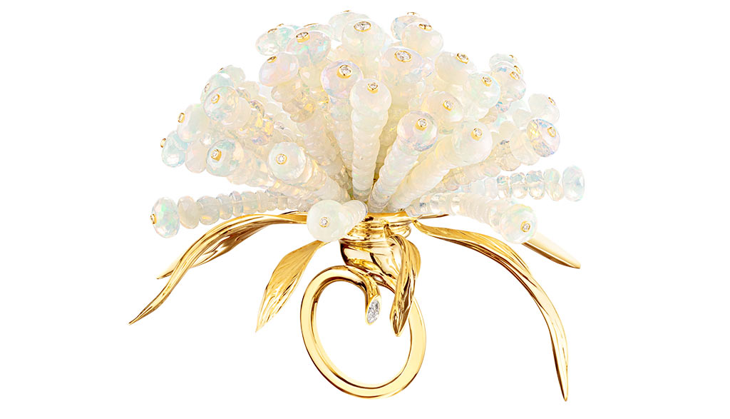 Еще один «ювелирный» цветок из новой коллекции Светланы Степановой. Кинематическое кольцо в форме одуванчика с вибрирующими от легкого прикосновения лепестками, выполненными из множества сверкающих опаловых бусин, вдохновлено мистическими сюжетами русских сказок. Волшебный одуванчик символизирует характерную для русского фольклора веру в чудеса и сказочную силу исполнения желаний.