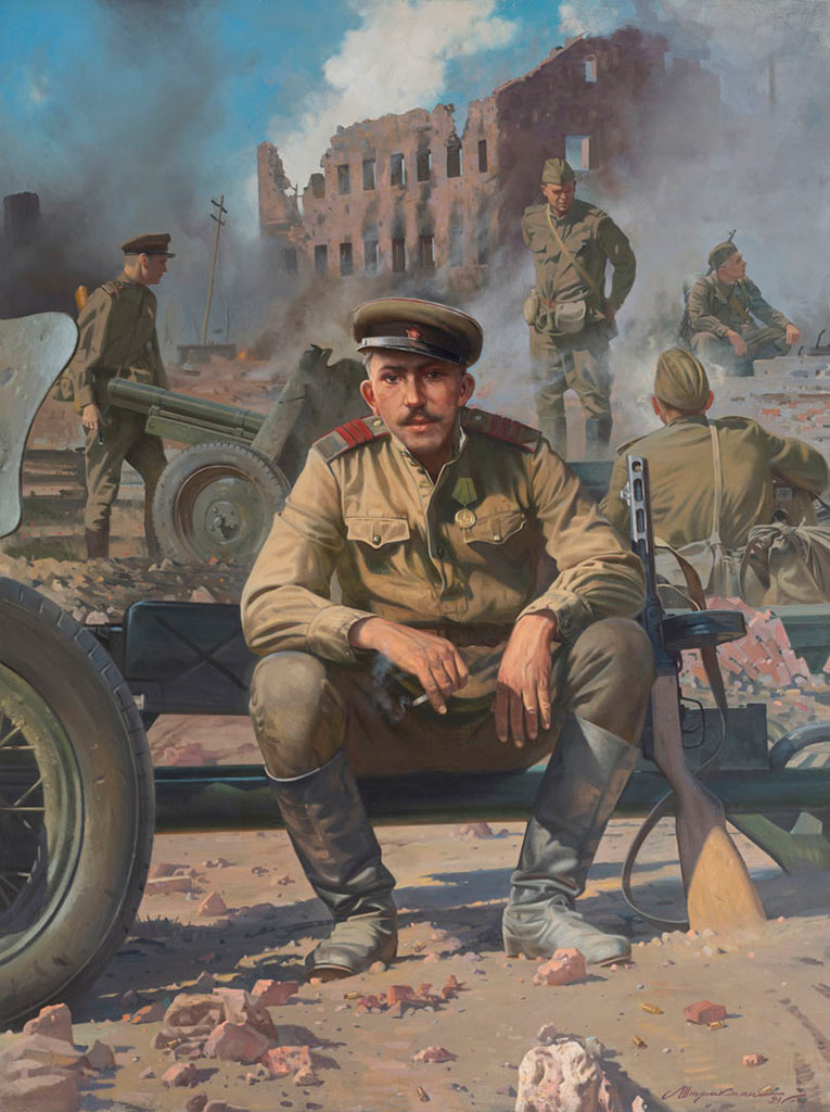 Егор Смирнов, молодой художник-грековец: «Одним из ярких впечатлений моей первой командировки на передовую стал сюжет картины «На Лисичанском блокпосту». Там я увидел и изобразил, как можно, находясь в условиях разрушенного города, когда кругом лежит разбитая техника, снаряды летают, диссонансом услышать смех солдат, которые прочитали какую-то веселую статью в газете. Вот они — эти суровые боевые бесстрашные мужики, мои вчерашние одноклассники, каждую минуту готовые к бою, продолжают радоваться жизни, мечтают о светлом будущем, и остаются людьми!»