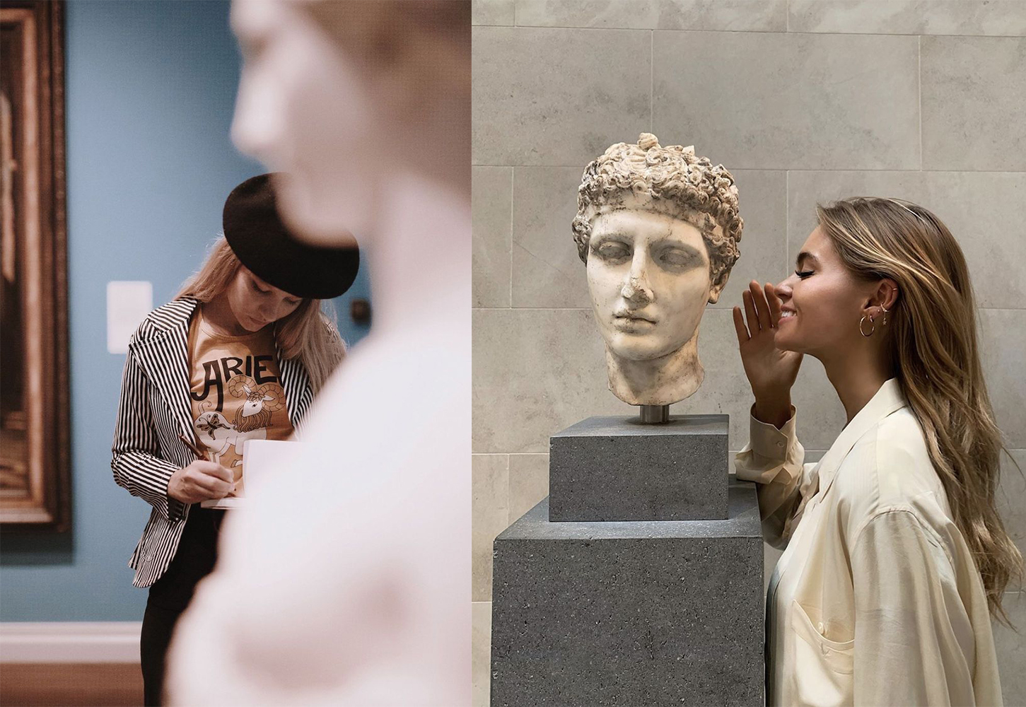 - Используйте экспозицию как фон. Включайте в кадр элементы выставки. Это может быть часть картины, скульптура, архитектурная деталь. Они создадут ощущение места и подчеркнут, где именно находилась модель во время фотосессии.