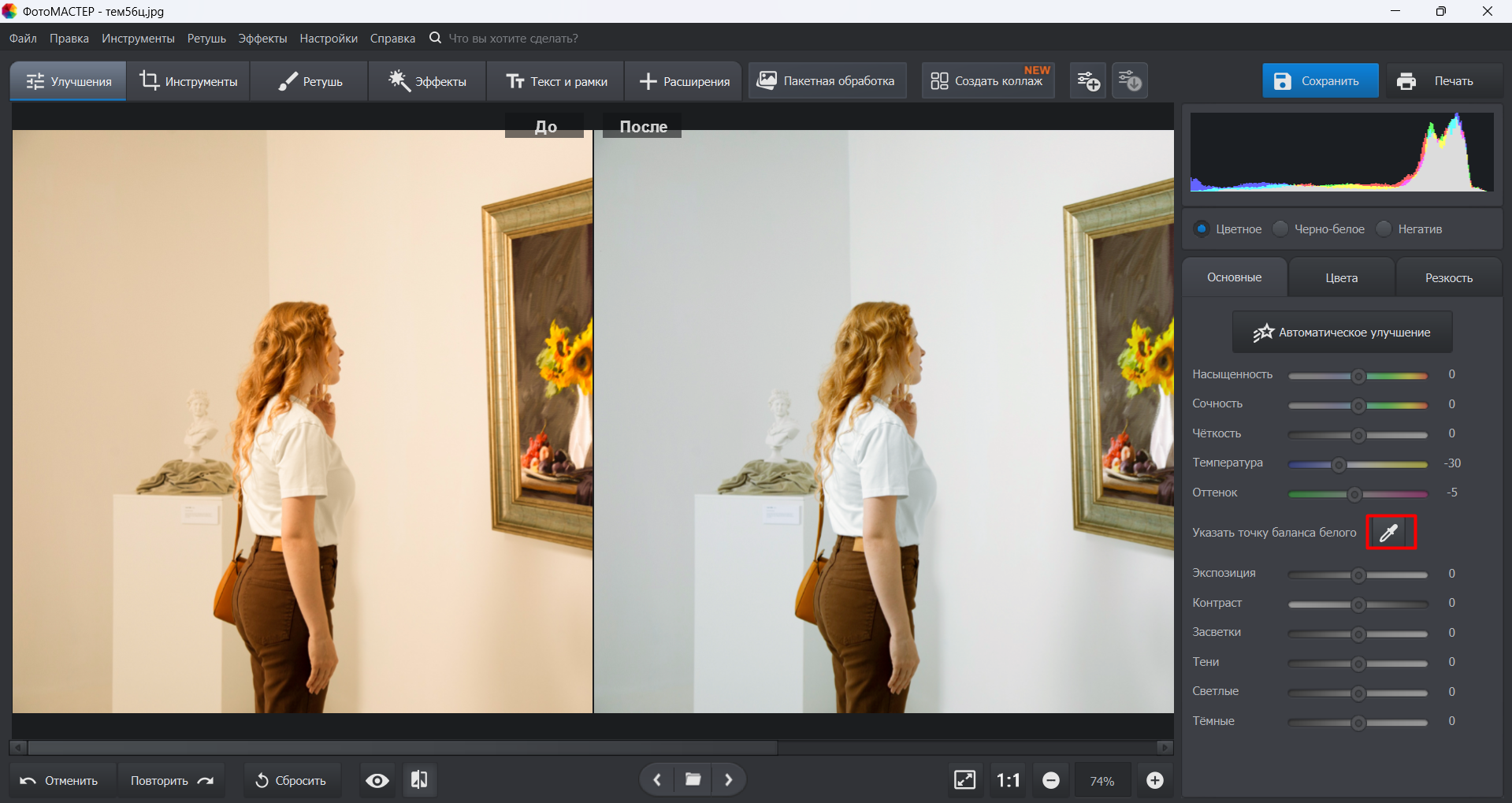 Некоторые редакторы (в том числе ФотоМАСТЕР) снабжены автоматической опцией определения баланса белого. Обычно инструмент выглядит как пипетка. Ею нужно навестись на самый нейтральный по цвету оттенок. Редактор проанализирует этот участок и автоматически скорректирует значение для всего изображения.