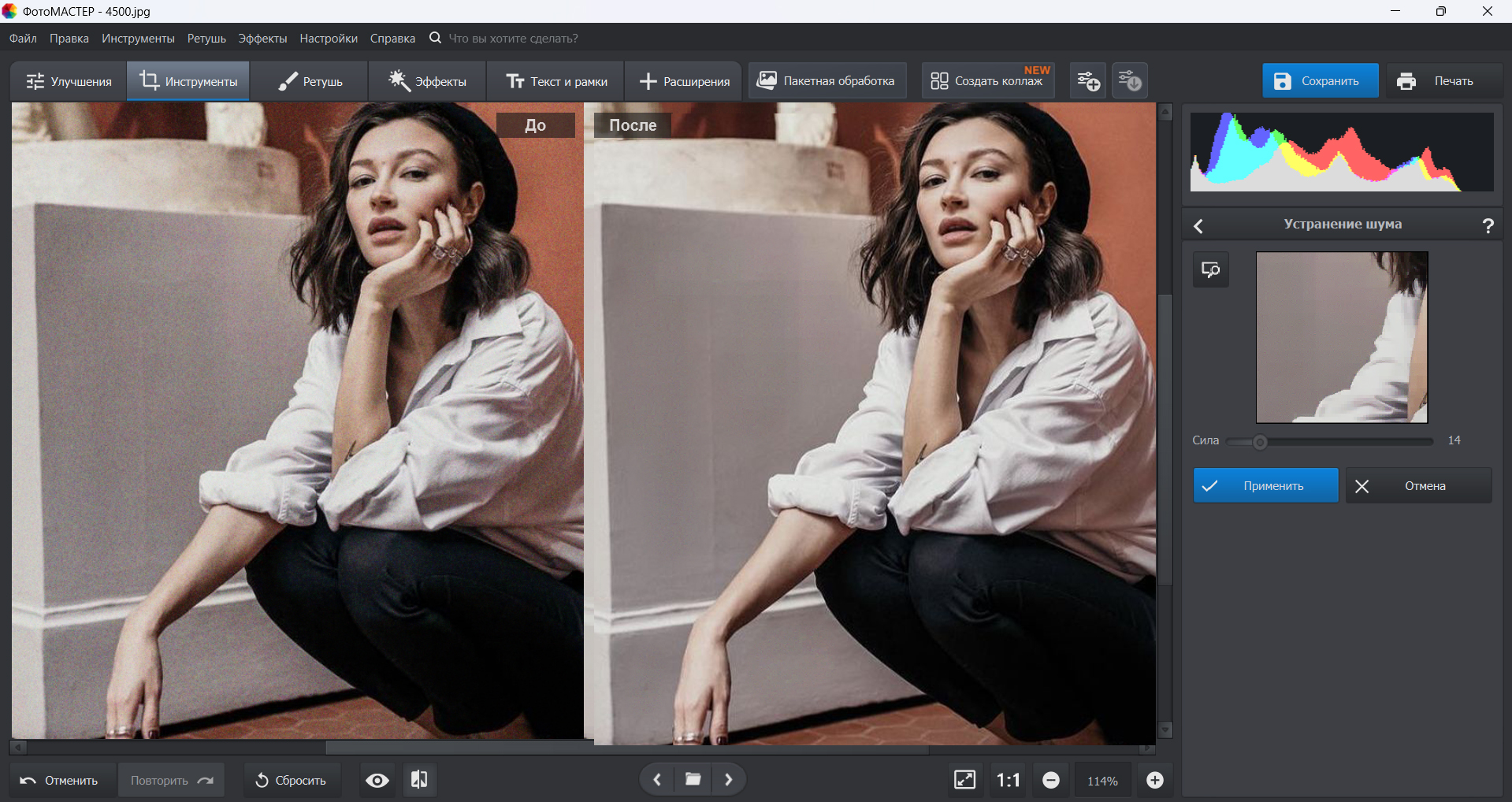 Для его устранения найдите в редакторе инструмент шумодава (называться может по-разному) и поднимите параметр силы. Побочный эффект — слишком сглаженное изображение, поэтому поднимать значение нужно аккуратно.