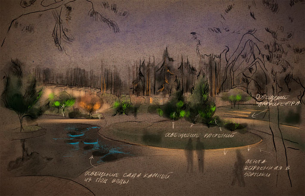 «Путь Света» – этот сценарий вдохновлен идеей странствий. Световые маршруты вдоль дорожек и аллей обозначены точечными светильниками и арками. Датчики движения обеспечивают навигацию и энергоэффективность, приглушая свет ночью, чтобы сохранить природные ритмы и не мешать отдыху гостей. Освещение выполнено с использованием невысоких светильников (до 5 метров), расположенных на расстоянии друг от друга, чтобы избежать визуального шума и гармонично вписаться в среду. Оборудование выполнено в тонах, сливающихся с природой, акцентируя внимание на самом свете.