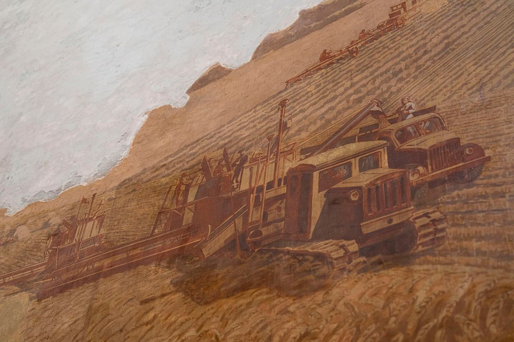 После полного раскрытия монументальной росписи было проведено исследование сюжетов и элементов панно. Эксперты скрупулезно выясняли, какая именно сельскохозяйственная техника была изображена на панно. Например, процесс лесозаготовок, отраженный на картине, проводился с использованием трелевочного трактора КТ-12, а сбор пшеницы — с использованием советского гусеничного трактора ДТ-54 и грузового автомобиля ГАЗ-51. Работы в поле велись при помощи колесного универсального трактора МТЗ-2 с прицепной сельхозмашиной. В проектной документации можно найти фотографии и исчерпывающую информацию о технике на «Карте МТС».