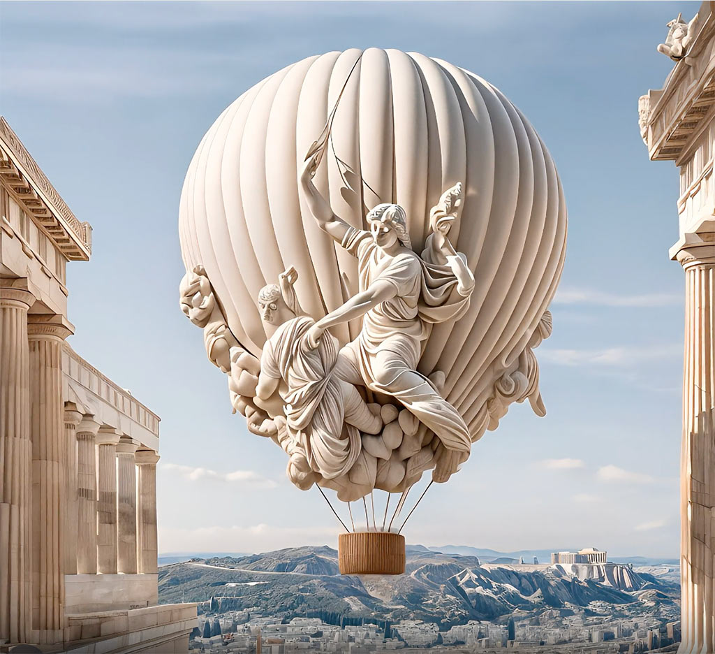 Выставка «Увидеть невозможное», организованная в сотрудничестве с галереей 365 ART, проводит зрителя сквозь стихии — воду, землю, воздух и огонь, — укрощенные искусственным интеллектом. В фантазиях Клаудио Мехмети объекты культуры органично покоятся в объятиях природы.