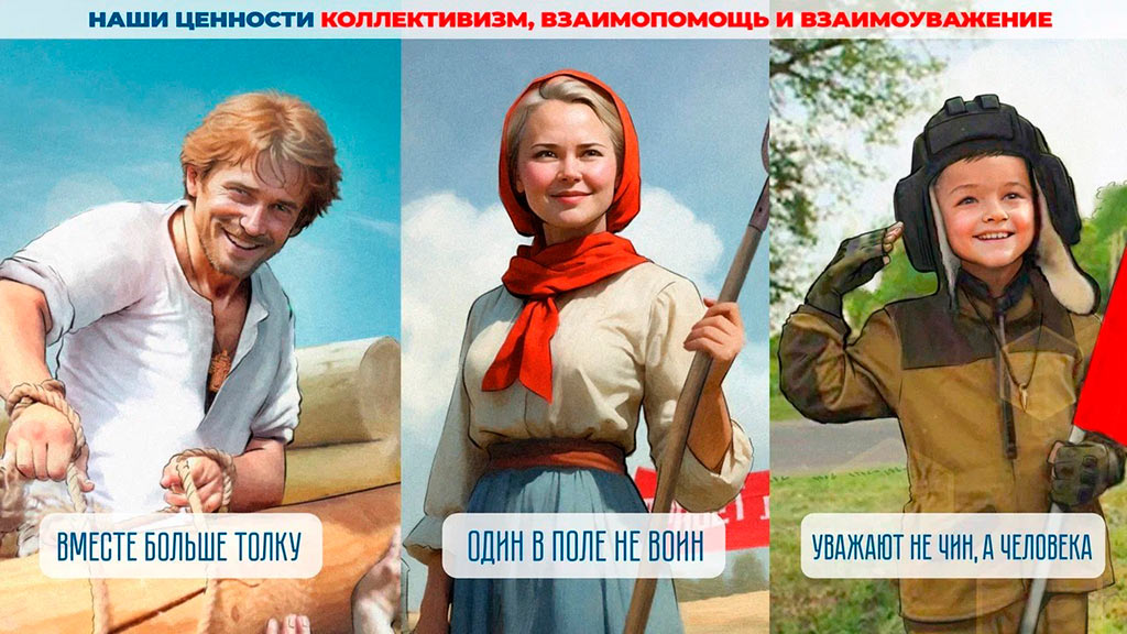 «Коллективизм – уникальная ценность российской истории и действительности, происходящая от соборного «всем миром», эта ценность помогает нашему народу добиваться высот духа и побед в самых сложных ситуациях на протяжении всей истории. Взаимовыручка и взаимоуважение – те ценности, что формируют ощущение общности и становятся сутью взаимоотношений людей, — пояснила Алена Август. – Взаимопомощь – когда всем миром за день строили избы на Руси, а сейчас всем миром мы помогаем нашим героям на СВО, всей страной становимся волонтерами и помогаем тем, кому сложно. И пусть слово «коллектив», привычное уху в советские времена, сейчас чаще звучит как «команда» — это суть нашего российского подхода к решению задач, когда важна ценность и компетенции каждого человека в команде, идущей к цели. Эта практика в наше время переосмысливается Мастерской управления «Сенеж» и помогает развиваться регионам, предприятиям, проектам. Основа взаимоуважения – признание безусловной ценности человека, независимо от его статуса, роли, уважение между людьми в нашей традиции есть уважение к человеку как личности, и мы визуально отразили это в контексте современной ситуации. Наши картинки становятся предметом дискуссии между поколениями и стимулом к осознанию ценностей».