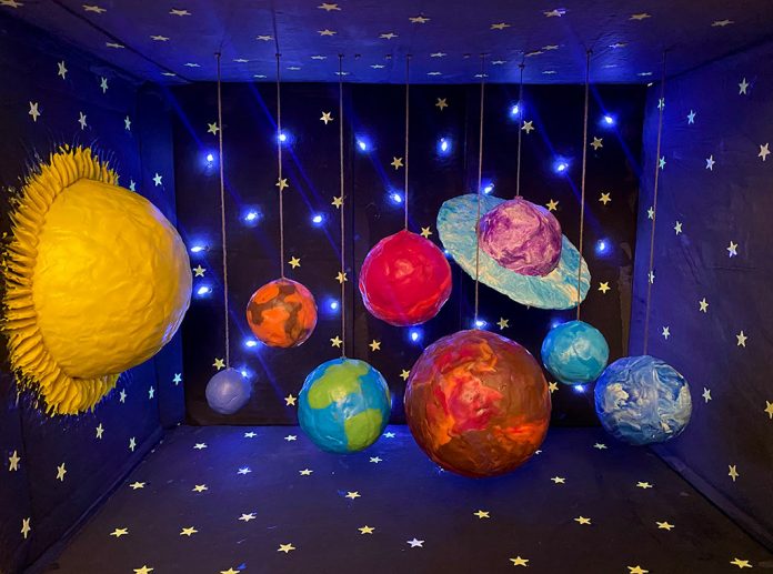 Художник Александр Агафонов, 9 лет. Космические дали. 2025. Картон, гуашь, пластилин, светодиодная гирлянда. | Россия, Чукотский автономный округ, г.о. Анадырь. МБОУ «СОШ № 1 г. Анадыря». Преподаватель Лидия Николаевна Воловик. Номинация: декоративно-прикладное искусство.