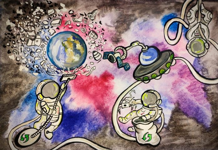 Художник Яна Белянцева, 9 лет. Космические дворники. Бумага, смешанная техника. 2025. | Россия, Владимирская область, Петушинский район, Костерёво. МБОУ Костеревская средняя общеобразовательная школа № 3 имени Гвардии лейтенанта Шишлакова Владимирской области Петушинского района. Преподаватель Галина Сергеевна Логуа. Номинация: живопись.