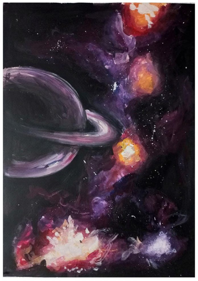 Художник Наталия Панкрушина, 13 лет. Космические просторы. 2025. Бумага, гуашь. | Россия, ЛНР, г. Красный луч. МБУДО «Краснолучская детская школа искусств». Преподаватель Светлана Владимировна Луцева. Номинация: живопись