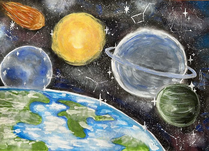 Художник Дарина Сметанина, 14 лет. Космическое путешествие. Бумага, гуашь. | Россия, г. Краснодар. Номинация: живопись.