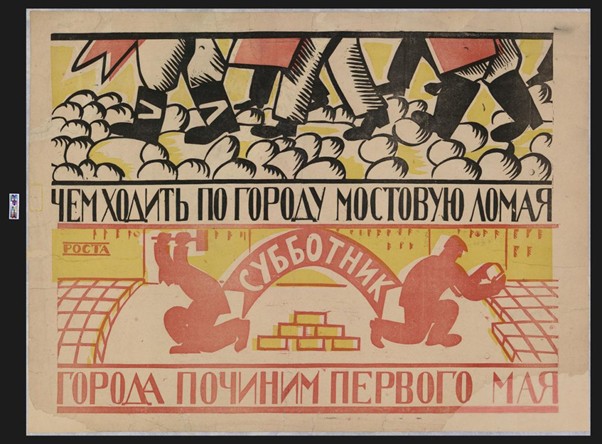 В 1921 году Маяковский откликнулся и на Первомай и написал плакат «Чем ходить по городу мостовую ломая – города починим Первого мая. Плакат Роста». На фоне динамичного и выразительного оформления, поэт использует метафору «ломания мостовой» как символ разрушения старого порядка и необходимости активных действий для создания чего-то нового. Текст на плакате, написанный в характерной для Маяковского манере, призывает к единству и коллективным усилиям в построении нового мира. Он звучит как манифест, вдохновляющий людей не только мечтать о переменах, но и активно участвовать в их осуществлении. Этот плакат стал символом надежды и стремления к лучшему будущему, отражая оптимизм и решимость эпохи.