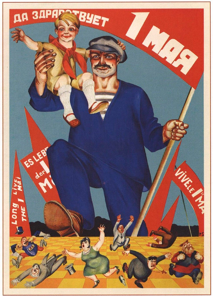 В могучем племени советских плакатистов было много ярких имён. Назовём ещё одно — Павел Соколов-Скаля. Встретив революцию в 18 лет, он загорелся ею, и она не оставила без взаимности горячего поклонника: в своё время он станет дважды лауреатом Сталинской премии, заслуженным и народным художником РСФСР, профессором… Но всё это в будущем. А в 1928 году он к 1 Мая изгоняет враждебные классы на нескольких языках, это одна из наиболее известных его работ «Да здравствует 1 мая». На нём изображен мужчина с ребенком на плече, вокруг красные плакаты, они с дитём шагают смело в счастливое будущее, наступая на буржуазию.