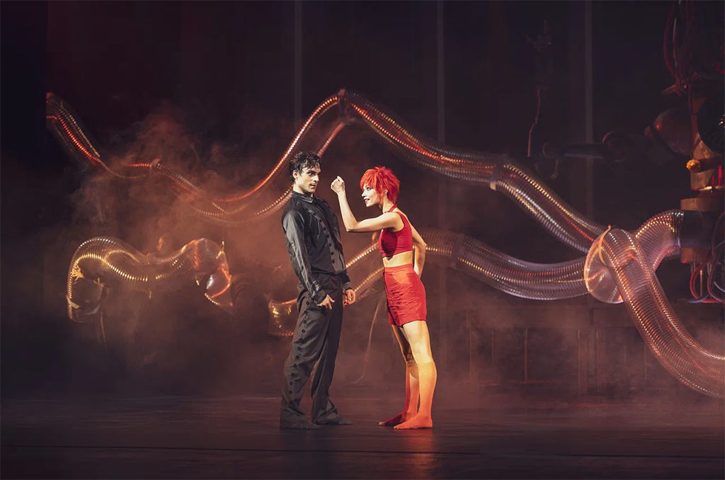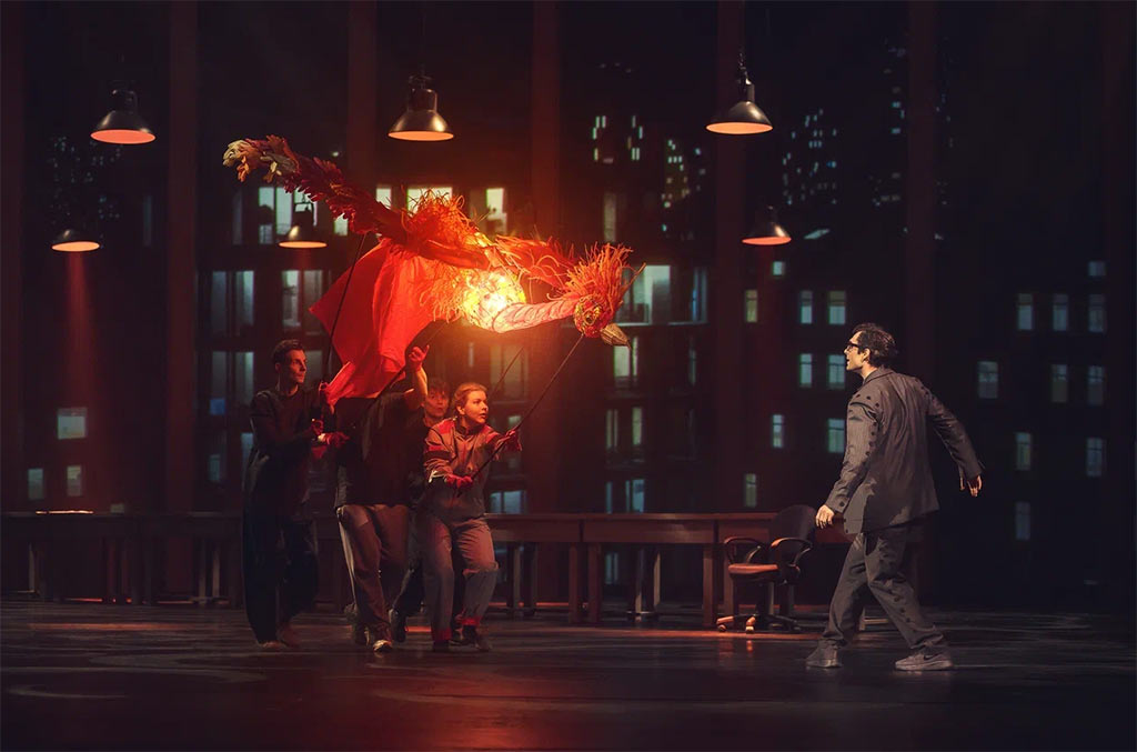 Для новой постановки «Жар-птицы» Алексей Франдетти написал собственное либретто, основываясь на сюжетном рисунке изначального либретто Бенуа, в котором Иван-Царевич борется с Кащеевым царством с помощью Жар-птицы. В спектакле Франдетти тоже есть Иван – архитектор, работающий над созданием проекта ЖК «Жар-птица». Только он борется уже с проблемами современного человека – с выгоранием и собственным творческим кризисом, который доводит его до такого безумия, что окружающий мир предстает в искаженном виде, а Жар-птица и прочие герои сюжета становятся неким видением. Здесь есть и образы, напоминающие героев первоначального либретто – царевен Кащеева царства, обращающихся в офисных сотрудниц, и даже самого Кащея – огромный строительный робо-агрегат с трубами-щупальцами. Есть и реминисценции, связанные с образами спектакля Стравинского, – вдохновенный финал исполняет дуэт практически самых настоящих Ивана-Царевича и Жар-птицы, но это всего лишь видение.