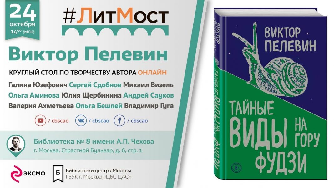 24 октября 2018 года, в 14:00 по московскому времени, в Библиотеке № 8 имени А.П. Чехова, в рамках проекта «#ЛитМост. Эксмо объединяет», пройдёт обсуждение нового романа Виктора Пелевина «Тайные виды на гору Фудзи». С помощью онлайн-трансялции поговорить о творчестве самого знакового российского писателя смогут литературные критики, эксперты и читатели со всей страны.