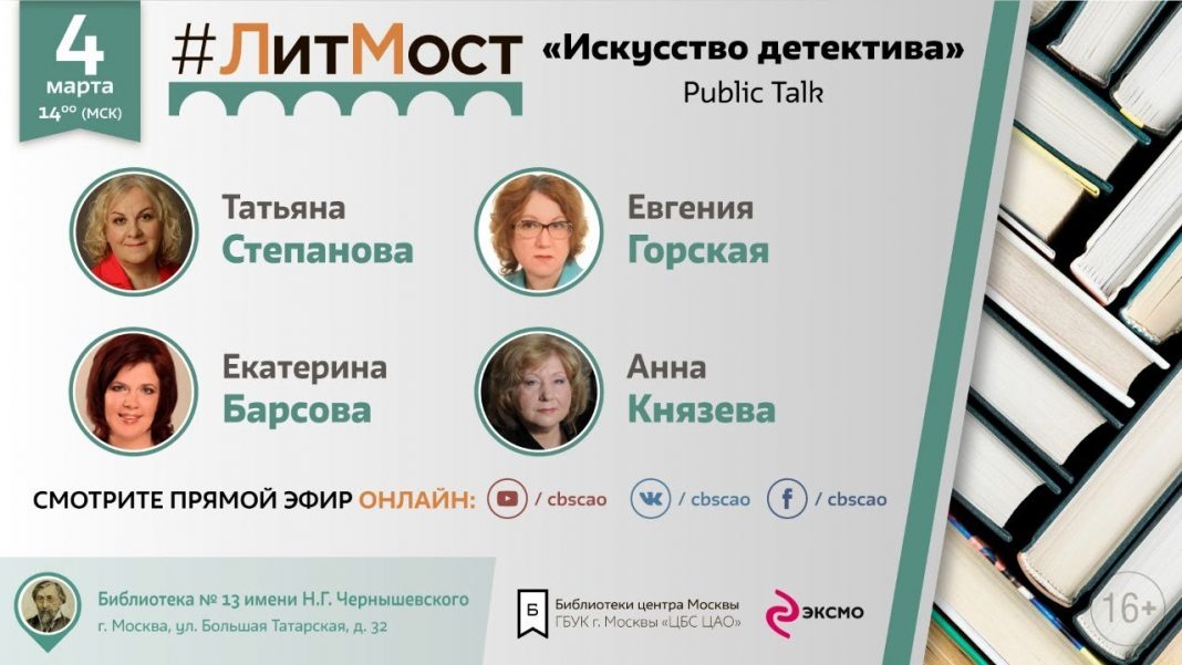 4 марта 2020 года в рамках проекта «#ЛитМост. Эксмо объединяет» состоялся Public Talk «Искусство детектива». Читатели библиотеки № 13 им. Н.Г. Чернышевского и жители разных регионов России смогли пообщаться с популярными авторами остросюжетных романов – Татьяной Степановой, Анной Князевой, Евгенией Горской и Екатериной Барсовой.