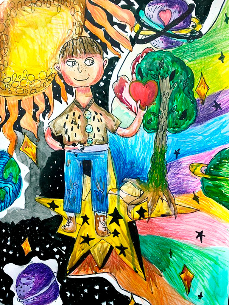 Художник Виктория Стрижакова, 10 лет. Мечты о космосе. Поиски во Вселенной. Бумага, тушь, гуашь, карандаши, маркер. | Россия, Ростов-на-Дону. Номинация: графика.