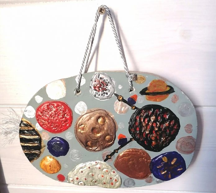 Художник Елизавета Дубограй, 9 лет. Между звёзд. Роспись и аппликация на деревянном спиле. | Россия, г. Симферополь. Номинация: декоративно-прикладное искусство.
