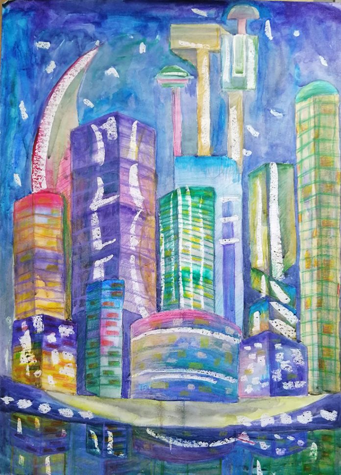 Художник Ксения Кублицкая, 12 лет. Мой будущий город. 2025 Бумага, акварель, цветные карандаши. | Республика Беларусь, г. Гомель. Детская художественная школа г. Гомеля. Преподаватель Елена Николаевна Кедрова. Номинация: графика