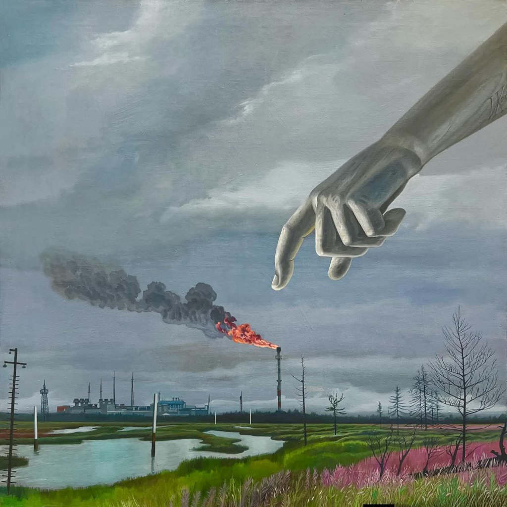 Отдельного внимания заслуживает диптих промышленных пейзажей, на которых богиня Земли Гея оценивает и простирает длань к газовому месторождению – Богатству Земли Русской.