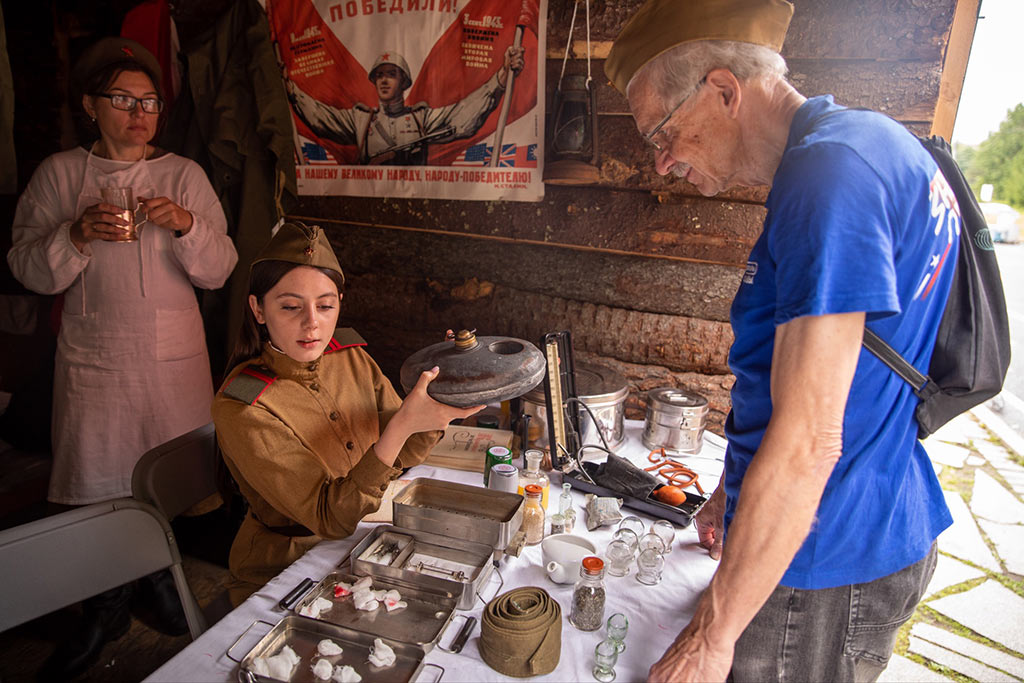 Самые активные гости поучаствовали в квесте «Вперёд к Победе!». За прохождение его локаций участники получали штампы-«звездочки» в «Красноармейскую книжку», а затем их награждали памятными призами и угощали фронтовой кашей и чаем на полевой кухне.