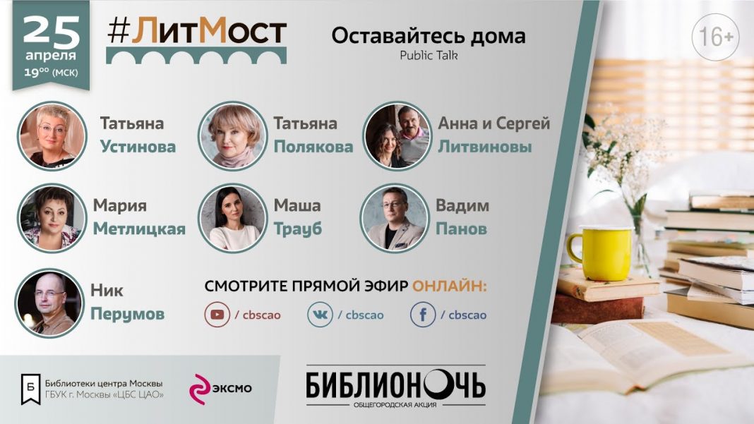 25 апреля в 19:00 приглашаем на прямой эфир «ЛитМост. Оставайтесь дома». Онлайн-встреча состоится в рамках проекта Библионочь-2020. В ней примут участие известные писатели: авторы детективных и остросюжетных романов Татьяна Устинова, Татьяна Полякова, Анна и Сергей Литвиновы, авторы современной сентиментальной и психологической прозы Мария Метлицкая и Маша Трауб, фантасты Вадим Панов и Ник Перумов.
