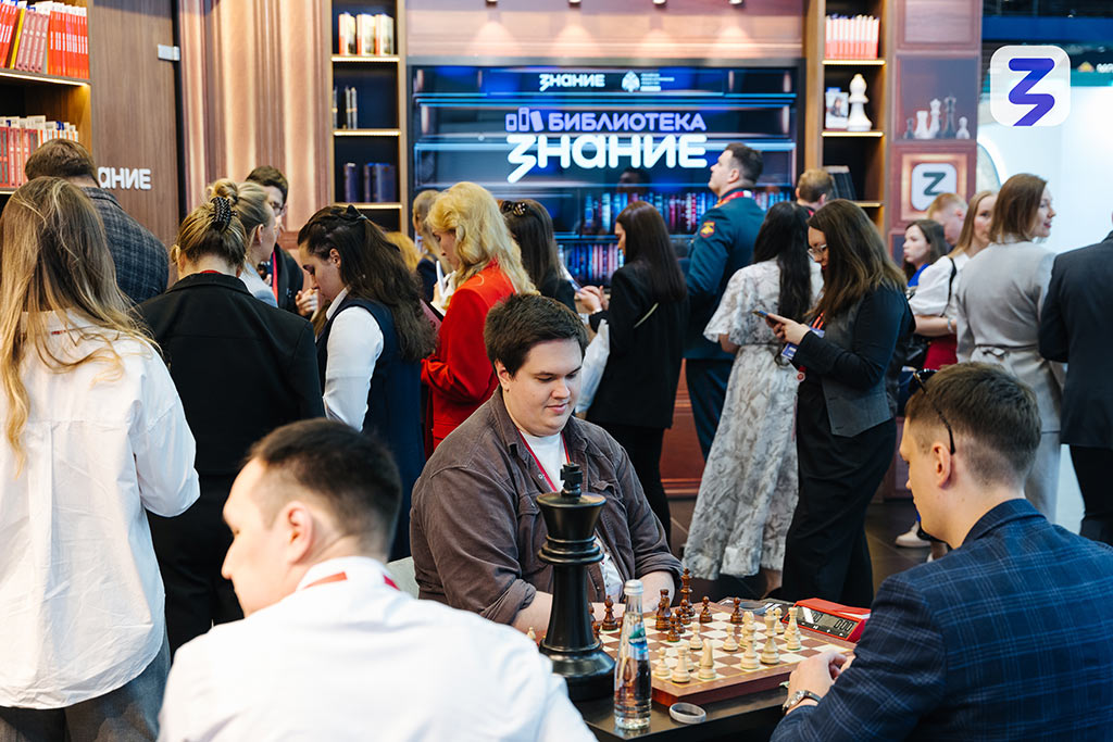Стилизованный стенд Знание.Библиотека вновь визуально подчеркивал ценность книги как универсального источника знаний. На его полках были представлены классические издания, рекомендованные лекторами Общества. За время форума посетители забрали с собой порядка 4 тысяч книг. Впервые на стенде была организована студия для съемок коротких тематических подкастов с гостями Форума, среди которых государственные и общественные деятели, эксперты в сфере экономики, культуры, науки, а также предприниматели и представители госкорпораций. Кроме того, Общество «Знание» и РВИО сделали зону интеллектуальных игр, где за время форума участники сыграли более 100 партий в шахматы.