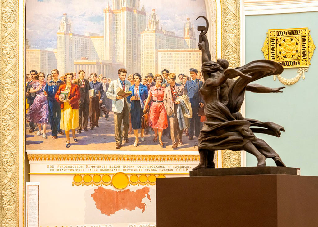 Выставка завершалась в купольном зале, в центре которого была представлена знаменитая композиция Веры Мухиной «Рабочий и колхозница», а по периметру — работы других мастеров 1930-1950-х годов.