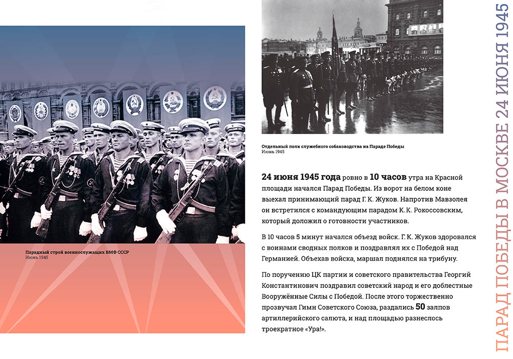 Выставка посвящена четырем знаменательным событиям победного 1945 года — Парадам Победы: 4 мая и 7 сентября в Берлине, 24 июня на Красной площади и 16 сентября в Харбине. Гости выставки могут узнать о подготовке и проведении парадов, о героях, которые в них участвовали, и о том, какое значение имели данные события в истории. Проект объединил десятки оцифрованных материалов из фондов Музея Победы: документы, фотографии, живописные произведения. На кадрах запечатлены марш Красной армии у развалин Рейхстага, советские войны, бросающие немецко-фашистские знамёна к подножию Мавзолея В.И. Ленина, гвардейские минометы «Катюша» на Параде Победы над Японией в Харбине. Также на планшетах показаны служебный пропуск для входа на Красную площадь в день Парада войск Красной армии 24 июня 1945 года, пригласительный билет на прием в честь участников Парада Победы в Большой Кремлевский дворец и программа концерта в Кремле.