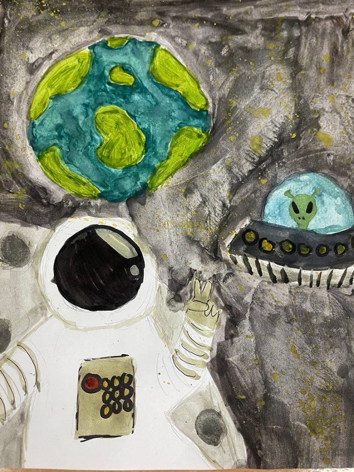 Художник Ксения Жур, 11 лет. Полёт к звёздам. 2025. Бумага, гуашь. | Россия, г. Екатеринбург. Номинация: живопись.