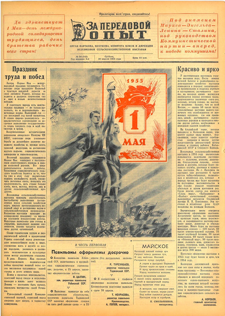 Благодаря статьям периодического издания выставки — газеты «За передовой опыт», а также архивным фото можно понять, как в разные годы украшали праздничные колонны сотрудников ВДНХ. В газете «За передовой опыт» от 30 апреля 1959 года содержится информация о том, как богато была украшена праздничная колонна Выставки: «Ветви цветущих яблонь, вишен, миндаля, крупные распустившиеся розы — все это будет украшать колонну Выставки достижений народного хозяйства СССР на первомайской демонстрации. 350 букетов сделали к празднику». Кроме того, в архиве ВДНХ сохранились уникальные фотографии, на которых запечатлены образцы художественного оформления первомайской колонны в 1954 году.