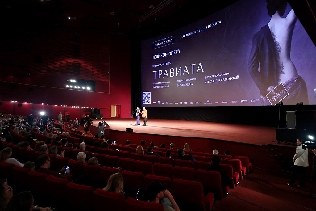С приветственным словом выступила начальник Управления информационного взаимодействия и веб-ресурсов канала «Россия-Культура» Наталья Литвинова: «Много знакомых лиц – это приятно вдвойне. Значит, у проекта много добрых друзей и верных поклонников – мы всегда рады вас видеть! Символично, что мы завершаем этот сезон киноверсией «Травиаты» театра «Геликон-опера». Кто-то наверняка помнит, что и первый, и второй сезон проекта начинались спектаклями театра «Геликон-Опера» – «Пиковой дамой» и «Золушкой». Наша благодарность руководству театра, Дмитрию Бертману и всему коллективу за смелость, с которой театр идет на эксперименты, открытость и доверие. Видя результат, к проекту «Театр в кино» присоединяется всё больше театров по всей стране».