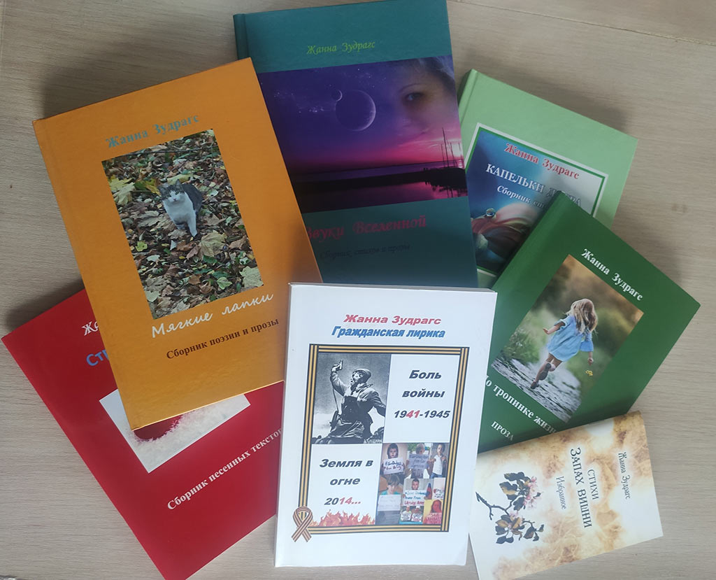 На свои средства поэтесса печатала авторские сборники стихов и прозы. Это: «Запах вишни», 2014 г.; «Боль войны. 1941-1945. Земля в огне. 2014 — …», 2015 г.; «Капельки добра», 2016 г.; «Звуки Вселенной», 2021 г.; «По тропинке жизни»; «Мягкие лапки», 2022 г.; Сборник песенных текстов, 2022 г. Свои книги Жанна верстала и оформляла сама или с помощью друзей. Получались очень яркие, интересные издания.