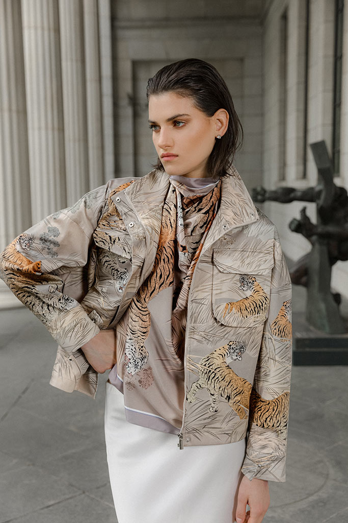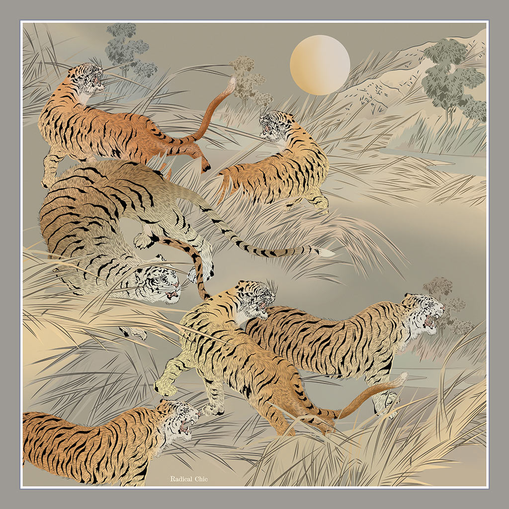 Например, дизайн «Хранители» создан по мотивам произведения Мисимы Сёсо (1856-1928) «Глупый план китайской армии использовать тигров как оружие» (1895). В работу решено было взять только одну из частей полиптиха, представляющую величественных и тигров-победителей в зарослях камыша под полной луной, оставив за кадром спасающихся от них бегством солдат. Рисунок выполнен в двух цветовых решениях и использован в капсуле одежды и аксессуаров сезона SS25.