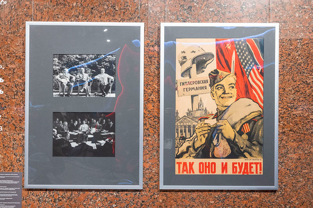 Экспозицию дополняют архивные фотографии, сделанные на Потсдамской конференции, в том числе известные снимки советского фотокорреспондента Евгения Халдея «Большая тройка» и «Потсдам», плакат Виктора Иванова «Так оно и будет» 1945 года, листовки и газетные статьи о Берлинской конференции.