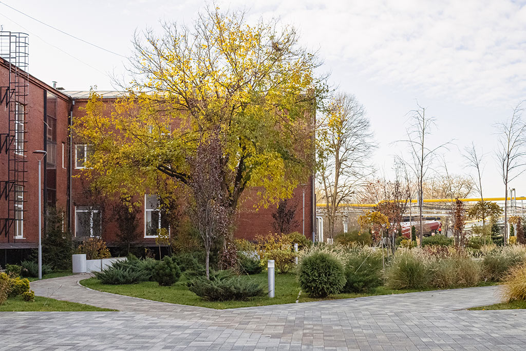 Чтобы исправить сложившийся образ неухоженной, непривлекательной территории, архитекторы посоветовали использовать максимально разнообразное озеленение. Кустарники: Бирючина обыкновенная, Дерен белый и Спирея серая, высаженные вдоль дорог, кроме эстетической, выполняют функцию защиты от пыли и грязи. Для поддержания ландшафта служат неприхотливые многолетники: ирисы, флоксы, зибольда, хоста Форчуна, вейник, кариоптерис, кизильник. Индустриальная территория приобретает вид городского сквера благодаря большому количеству деревьев – липы, ивы, клена, ели, вяза.