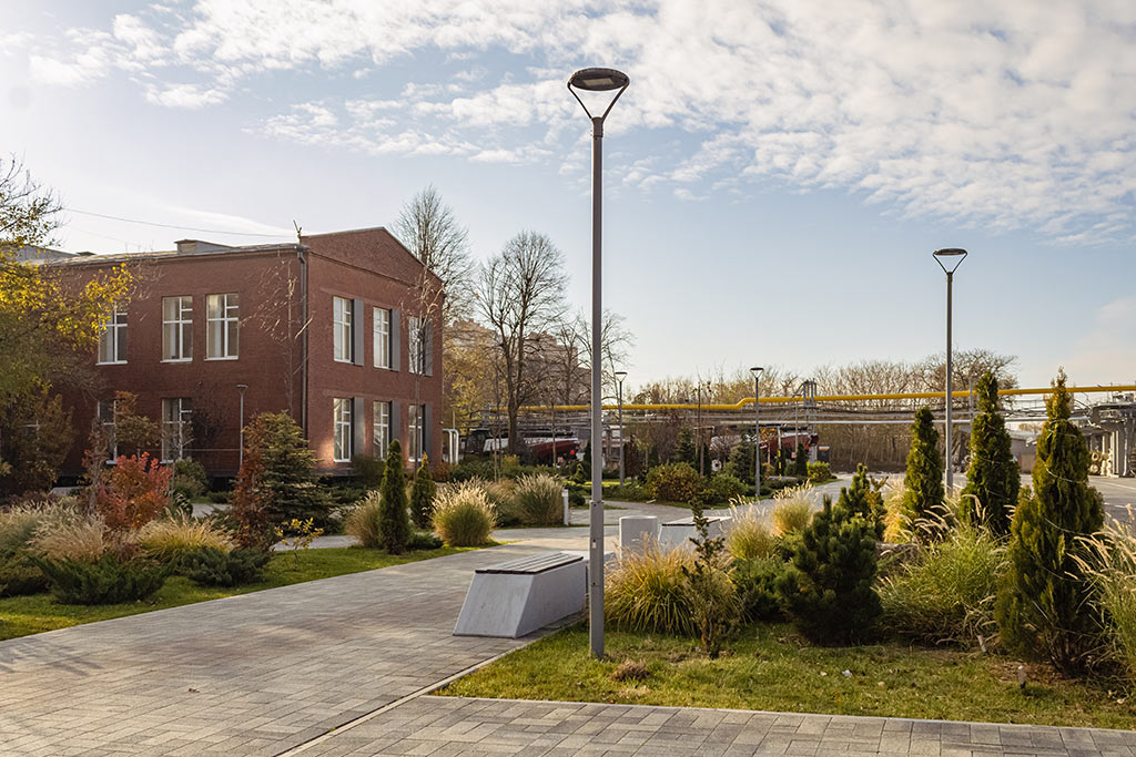 В проекте благоустройства территории было переосмыслено 10 зон: проходные и примыкающие к ним площади, точки въезда с КПП, фрагменты транзитных путей, пространство возле столовой, а также главная площадь 60-летия Ростсельмаша. Для каждой зоны был подобран визуальный язык, который отражает концепцию конкретного места, при этом соответствуя основным принципам индустриального пространства: функциональности и безопасности. Обновления были адаптированы к существующей инфраструктуре, включающей сложные транспортные узлы, производственные здания и инженерные коммуникации. Основные изменения коснулись покрытия, озеленения, освещения, оформления фасадов, а также организации удобной навигации по территории.