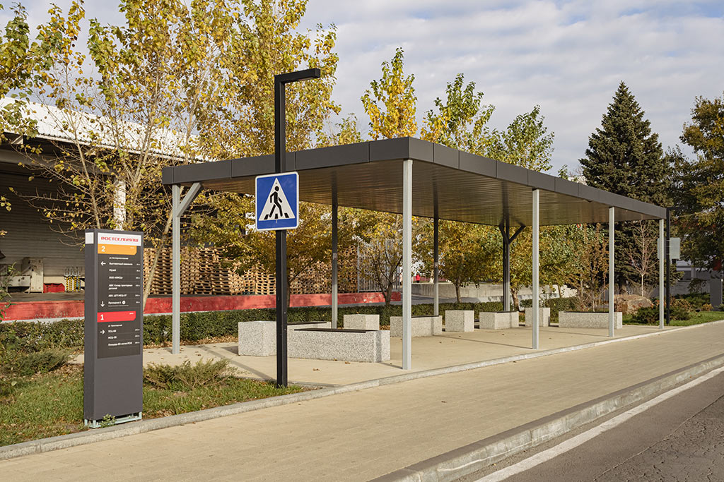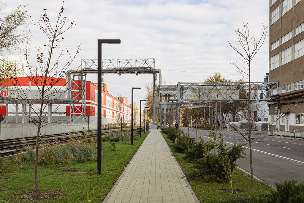 Для максимально безопасного передвижения пешеходов по территории завода предложено на протяжении всех маршрутов добавить тротуары и «зебры». Улучшения видимости гарантирует качественное освещение — равномерно расставленные фонари двух типов: высокие опоры и небольшие ландшафтные столбики. Первые установлены вдоль путей и на основных рекреационных зонах. Вторые – служат дополнением и элементом, который обеспечивает более камерную, уютную обстановку в местах для отдыха, организованных вдоль основных транзитных путей. Это лавки с урнами под навесами, чтобы спрятаться от активного солнца. У всех лавок есть мощное монолитное основание, которое поддерживает эстетику самого завода – белые кирпичные или сборные здания из бетонных плит с красными акцентами. Навесы простой прямоугольной формы имеют в основе металлические колонны и крышу с отделкой металлическим листом. Минималистичные строгие фонари простой геометрии также призваны создавать современный образ среды.