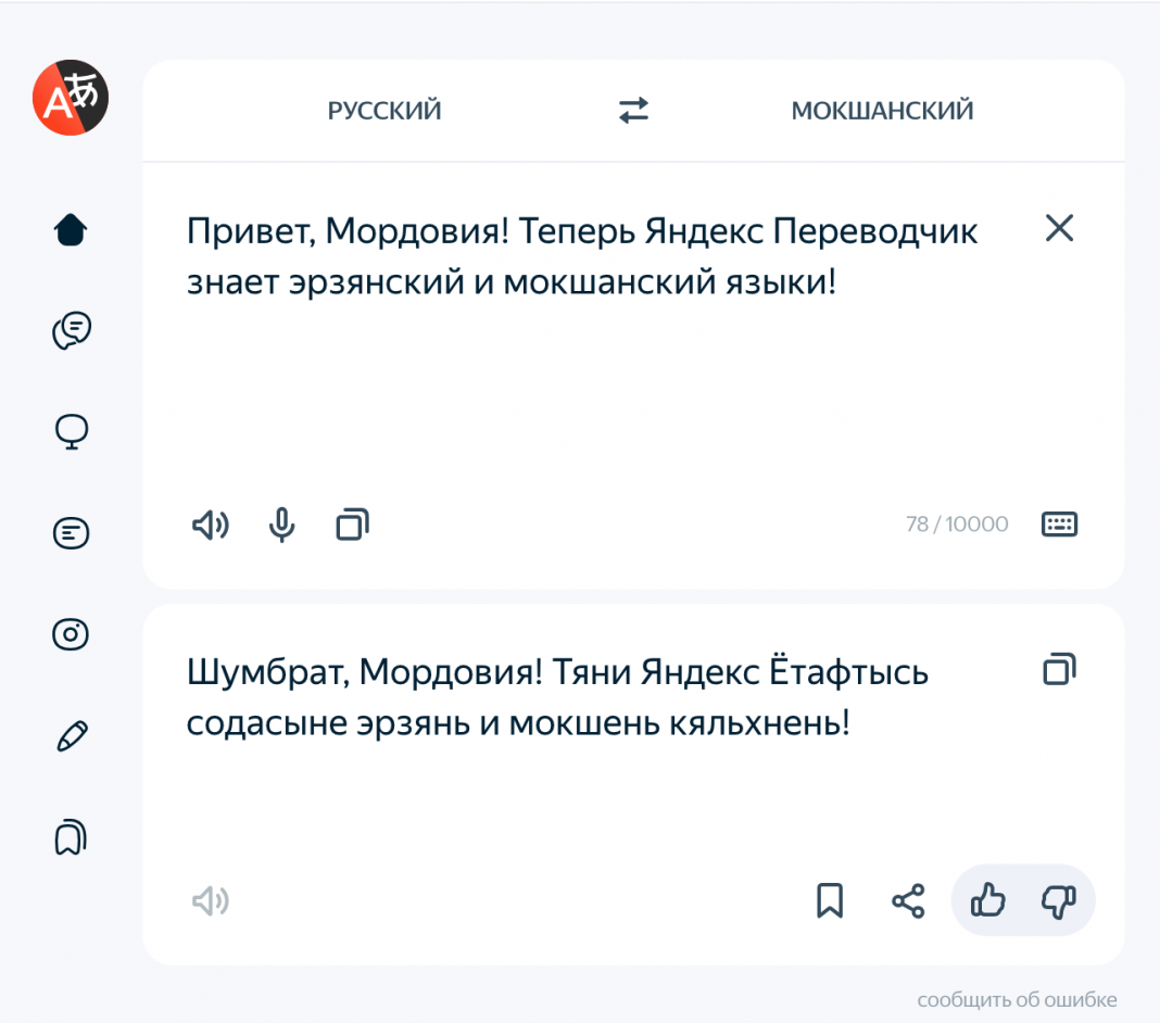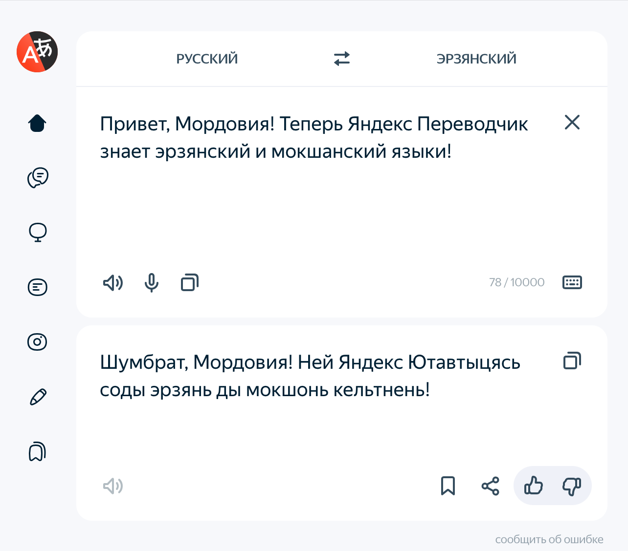 Пользователям Яндекса стало доступно сразу два мордовских языка — эрзянский и мокшанский. Они появились на сайте и в приложении Переводчика, а также в Поиске. Таким образом Яндекс продолжил развивать проект по внедрению в свои сервисы языков народов России, который запустил около года назад. За это время компания добавила пять языков: помимо мордовских, это осетинский, коми и тувинский.