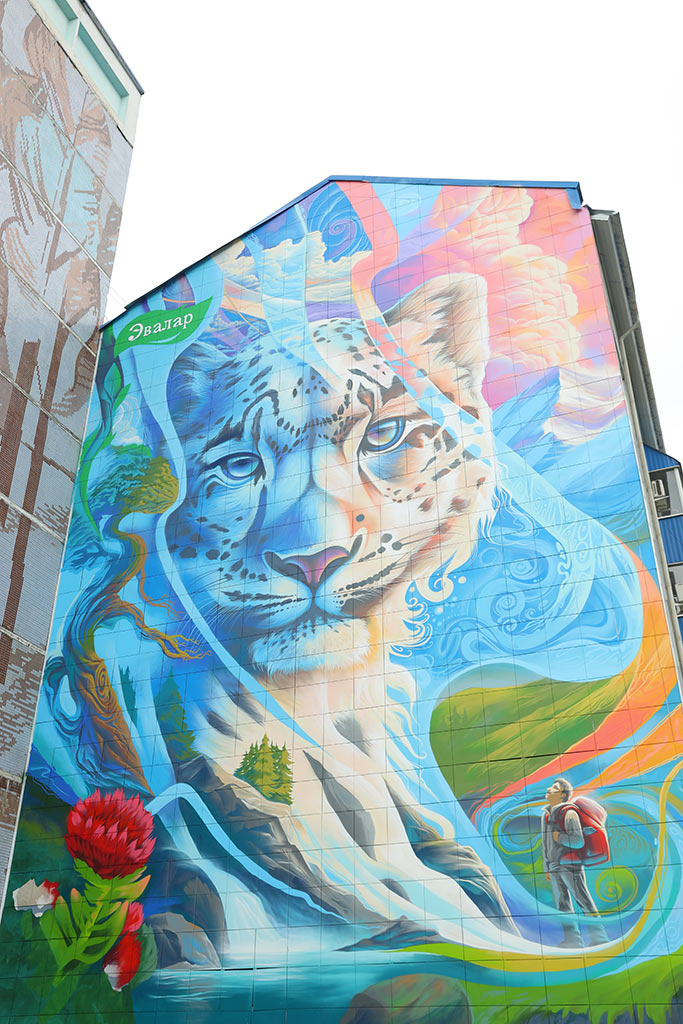 В Горно-Алтайске открыли мурал, главным героем которого стал снежный барс. Его автор – самый известный стрит-арт художник России Георгий Куринов, он же GOOZE ART. Инициатором проекта стала компания «Эвалар», которая на протяжении ряда лет реализует на Алтае программу сохранения популяции снежных барсов. Проект реализуется при поддержке Правительства Республики Алтай в рамках эко-фестиваля «Земля снежного барса».