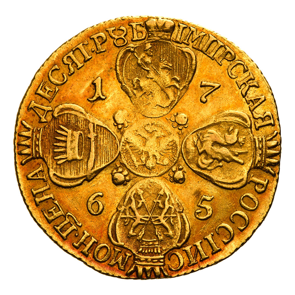 Но даже на этом фоне история золотой монеты 10 рублей 1765 года стоит особняком. Первые пробные монеты были выпущены в 1765 г., а чеканка монет рублевого номинала продлилась до начала 1770-х годов. Долгое время исследователи считали, что Фридрих II чеканил только серебряные номиналы, однако в XIX веке в коллекции великого князя Георгия Михайловича появилась диковинная золотая монета – 10 рублей 1765 года, отчеканенные вероятно в Пруссии.