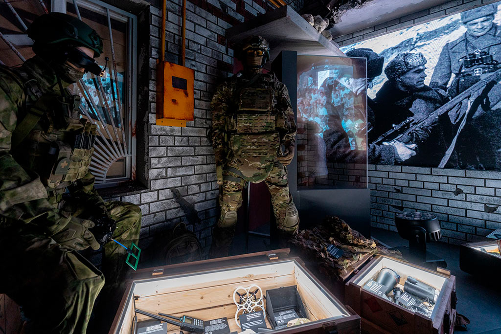 Выставочное пространство «Музея СВО» разделено на семь частей. Среди них макет зоны боевых действий, «Аллея славы», мемориал «Путь воина», разделы «Городской бой», «Опорный пункт», «Русский лес — боевая ботаника» и «Крым».