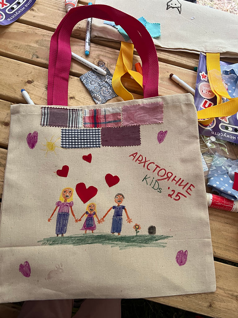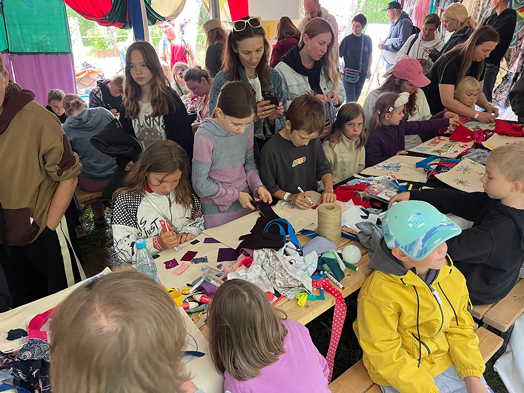 Параллельно во втором шатре проводились мастер-классы по печати штампов на экосумках с использованием материалов от компании «Гамма». Семьи с детьми приезжали целенаправленно на эти занятия, очередь не рассеивалась весь день. Печать штампов стала своеобразным шоу — люди сидели не только за столами, но и на земле вокруг шатра, несмотря на дождь.
