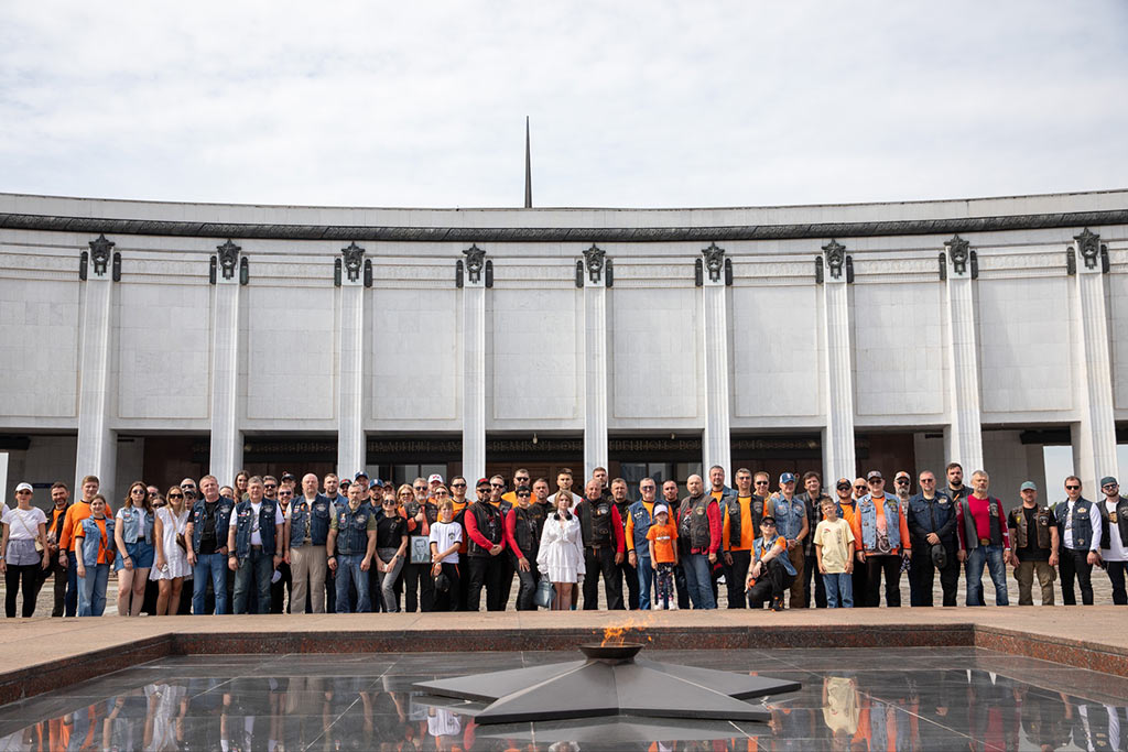Колонна из 30 мотоциклов прибыла на территорию мемориального комплекса на Поклонной горе. Участники мотопробега возложили цветы к Огню Памяти и Славы возле Музея Победы и почтили минутой молчания память всех погибших в годы Великой Отечественной войны.