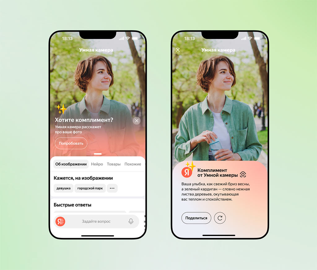 Нейросети в Умной камере научились делать комплименты. Благодаря тому, что технологии компьютерного зрения могут распознавать даже мелкие детали на изображениях, Умная камера в приложении «Яндекс» напишет приятные слова персонально для каждого пользователя. Например, про его цвет глаз, улыбку, образ или причёску. Комплиментами можно делиться, чтобы поднять близким настроение, или использовать их как текст для открытки, например, валентинки. Для этого нужно сделать селфи, фотографию или загрузить уже готовый снимок и написать в строку запроса «сделай комплимент».