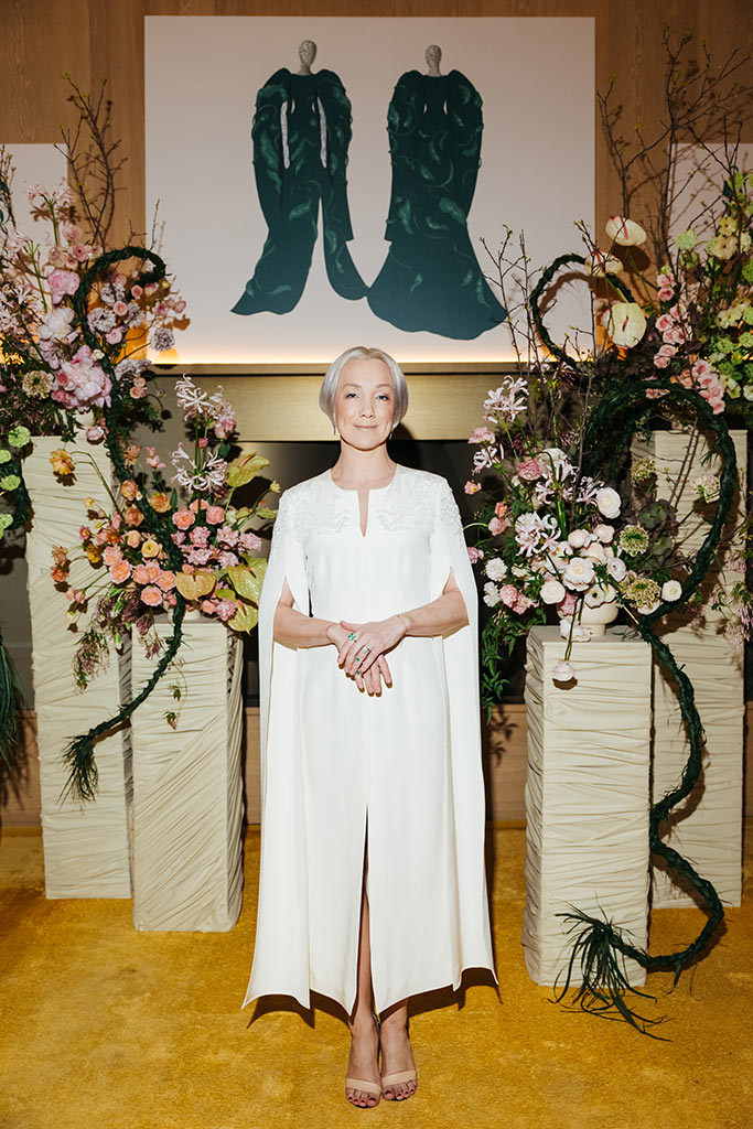 В модном доме Alena Akhmadullina подчеркнули, что вдохновением для образа послужили национальные художественные традиции и природные мотивы. Платье с символичным названием «Волшебный лес» отсылает к образу русского народного костюма с длинными пышными рукавами и тонким силуэтом. Все швы выполнены в органичной, биоморфной эстетике — без прямых линий, словно повторяя пластику растительных форм. На контрасте с современной архитектурной пластикой тайвека, платье украшено объемными 3D-листьями, выполненными в кутюрной ручной технике.