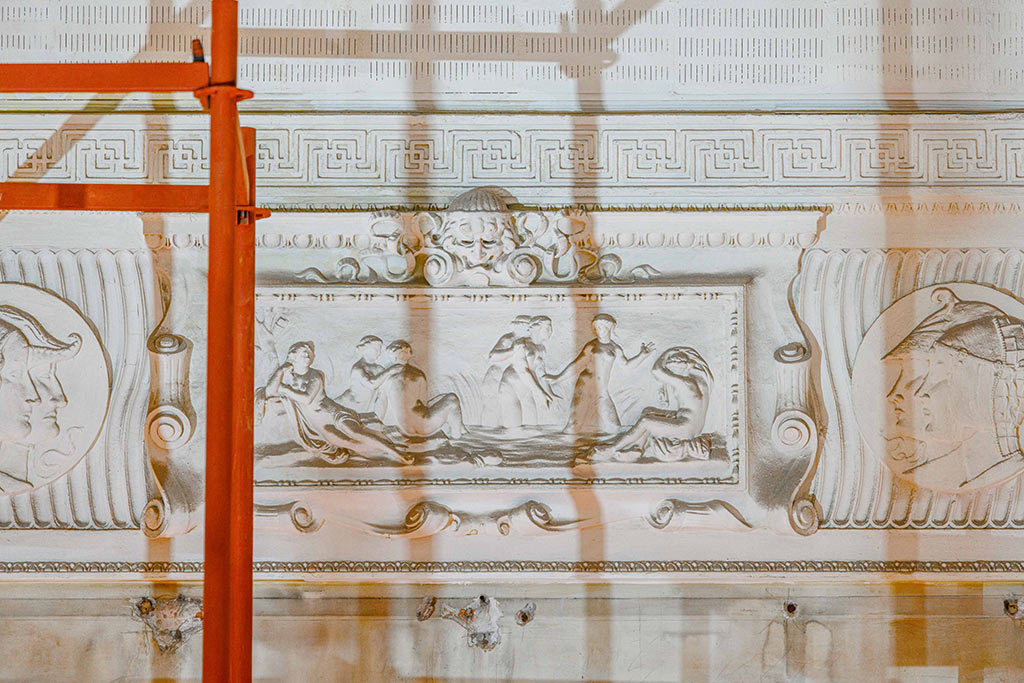 Реставраторы восстановят исторические интерьеры театрального зала, приспособленного под Первую студию Дома Радио. Подвесной потолок тщательно обследуют и устранят его повреждения, а уникальные 200-килограммовые люстры на время реставрации демонтируют для сохранения оригинальных деталей. Важной частью проекта станет расчистка и восстановление лепного декора разных периодов, в том числе 14 дореволюционных гипсовых панно, украшающих своды зала, с бережным восполнением утраченных фрагментов.